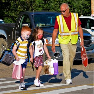 - Photo by Scott McCloskey Middle Creek Elementary employee Mark Williams assists twins Logan and Riley McKenzie at the school’s crosswalk Wednesday morning.