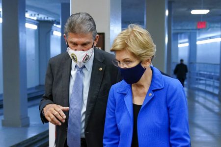 Sen. Joe Manchin, D-W.Va., left, speaks with Sen. Elizabeth Warren, D-Mass., on Capitol Hill in Washington, Wednesday, Oct. 27, 2021. (AP Photo/Patrick Semansky)
