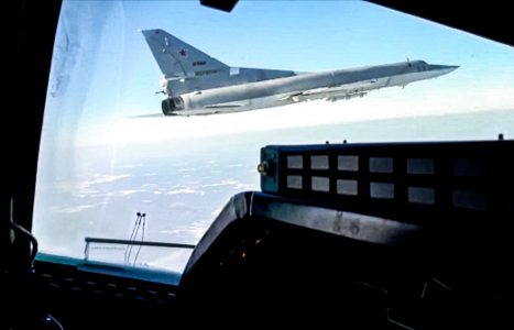 In this photo taken from video and released by the Russian Defense Ministry Press Service on Saturday, Feb. 5, 2022, A view of a Tu-22M3 bomber of the Russian air force seen from the cockpit of another such plane during a training flight. Two Tu-22M3 long-range bombers of the Russian air force performed a patrol mission over Belarus on Saturday amid the tensions over Ukraine. (Russian Defense Ministry Press Service via AP)