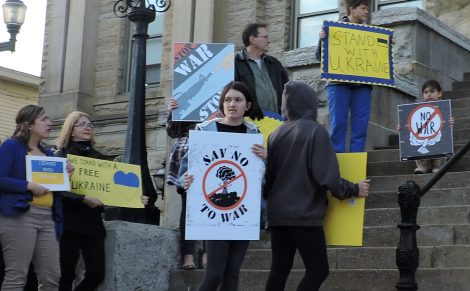 Residents, many wearing blue and yellow, the colors of Ukraine, gathered outside the courthouse and held signs of support and waved flags. A prayer was said for the people in Ukraine then the National Anthem was played followed by the Ukrainian national anthem.