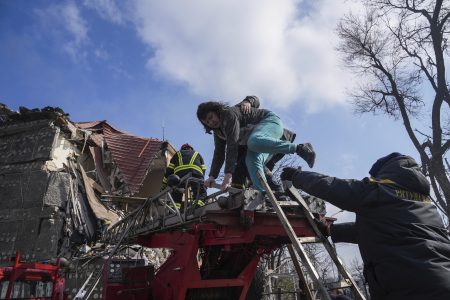 Firefighters help a woman to evacuate from a damaged by shelling apartment building in Mariupol, Ukraine, Thursday, March 10, 2022. (AP Photo/Evgeniy Maloletka)