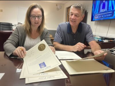 Photo Provided - Ohio County Schools Executive Secretary Ann Senkbeil, left, and Federal Programs Director Walt Saunders prepare Stifel Awards to be delivered to Ohio County Schools students.