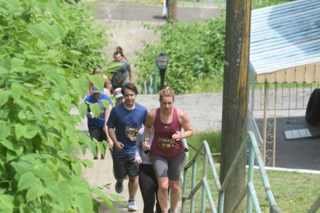 Participants in the Tough as Nails Urban Challenge presented by The Health Plan climb the Stairway to Heaven obstacle in mile 4 of the contest. As they passed, several of them indicated the long climb was one of the most dreaded challenges on the course. (Photo by Jennifer Compston-Strough)