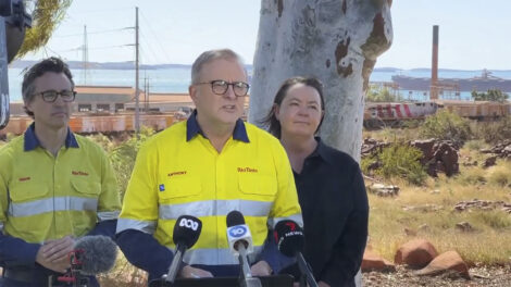 In this image made from video, Australian Prime Minister Anthony Albanese, center, speaks to the media following an aircraft crash in Karratha, Australia, Sunday, Aug. 27, 2023. Three United States military personnel were taken to a hospital, one with critical injuries, after a U.S. aircraft crashed on a north Australian island Sunday during a multination military exercise, officials said. (AuBC via AP)