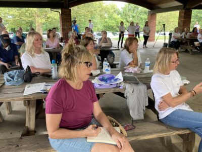 Members of the community attend a gathering organized by the the Ignite Hope group Thursday night at the Sonneborn Shelter at Wheeling Park. Speakers addressed the issue of human trafficking.