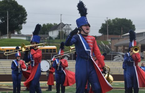 Wheeling Park High School marching band member Landon Smeltz performs a verse from “My Shot” from the musical “Hamilton” during Saturday’s first competition of the West Virginia Governor’s Cup Marching Band Series at Monarch Stadium in Moundsville. Five bands competed in total. The Patriots were second runner-up Saturday, with Philip Barbour first runner-up and Paden City as grand champion. (Photo by Derek Redd)