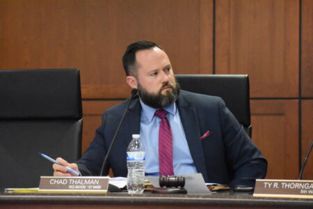 Wheeling Vice Mayor Chad Thalman presides over a regular meeting of Wheeling City Council Tuesday night.