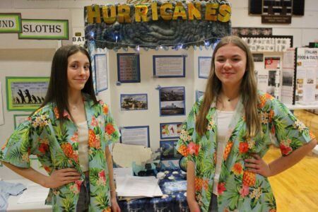 Students Adah Aubrey and Emily Gatts pose in front of their project about hurricanes during the Marshall County Schools Social Studies Fair held Thursday at the John Marshall Field House. (Photo Provided)