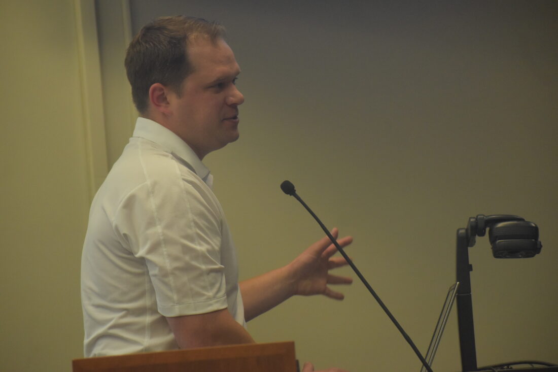 Jim Ambrose, president of Tipping Point, presents a recommendation to Wheeling City Council this past week on the future of the vacant Clay School property in East Wheeling. (Photo by Eric Ayres)