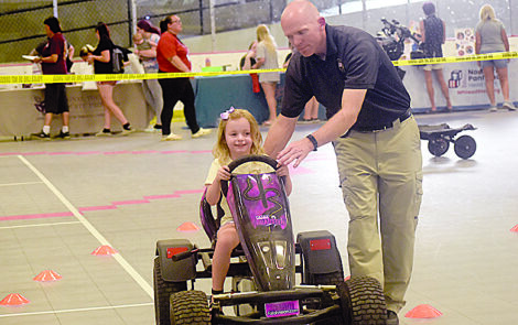 Myla Berry, 4, of Wheeling, tries out the impaired driver course with the assistance of Wheeling Police Officer Jason Chambers – and without the “Fatal Vision” goggles typically used on the course to simulate how difficult and dangerous it is to maneuver around with diminished senses.