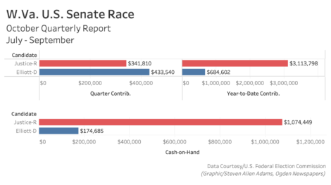 In the U.S. Senate race, Republican Gov. Jim Justice has substantially more cash going into the next 20 days until Election Day on Nov. 5. But for the second reporting period in a row, Democratic former Wheeling mayor Glenn Elliott showed that he can keep up with the governor when it comes to quarterly donations.