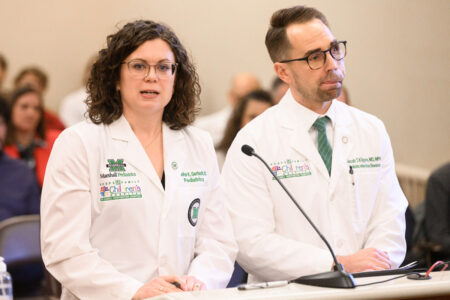 Doctors Jennifer K. Gerlach and Jacob Kilgore with Marshall Health tell members of the state Senate Health Committee about the benefits of childhood immunizations.