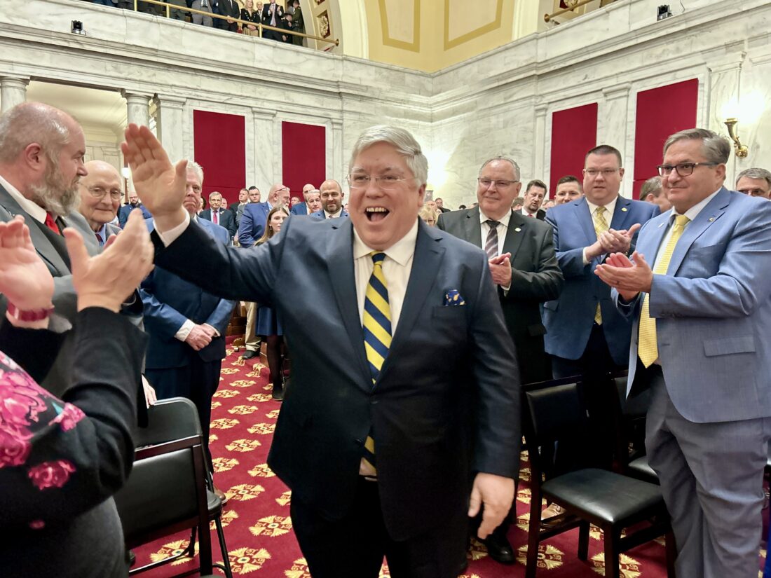 Gov. Patrick Morrisey greets attendees of his first State of the State address in the House of Delegates Chamber Wednesday.