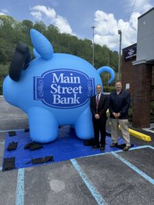 Executive Chair Mark Whitmer, left, and board member Nick Sparachane pose in front of the Main Street Bank inflatable pig, a new addition at this year’s shareholder’s meeting. (Photo Provided)