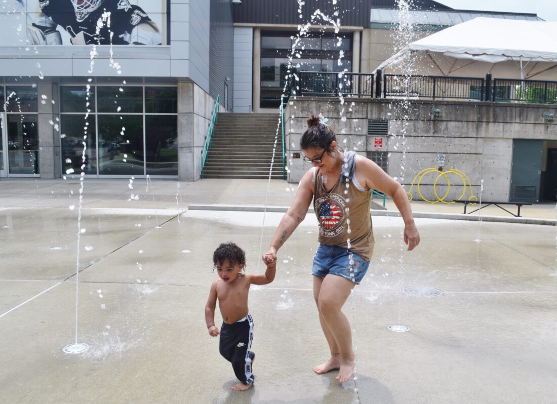 Patty Cowan of Martins Ferry takes her grandson, soon-to-be-2-year-old Kingstyn Clark, through the splash pad outside WesBanco Arena as folks took advantage of the summer weather to get out Thursday and enjoy the area around WesBanco Arena and Heritage Port.