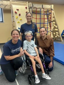 Recently, Conley has been working with Julia on maneuvering her wheelchair manually. In the past, it was a struggle to get her to place her hands on the push rims. She now has begun to spontaneously and purposefully back up, turn or go forward. Wilson is working to strengthen Julia’s muscles so she can go from lying down to sitting up or vice versa without help. She also is taking steps independently with a specialized gait trainer donated by a local family.
