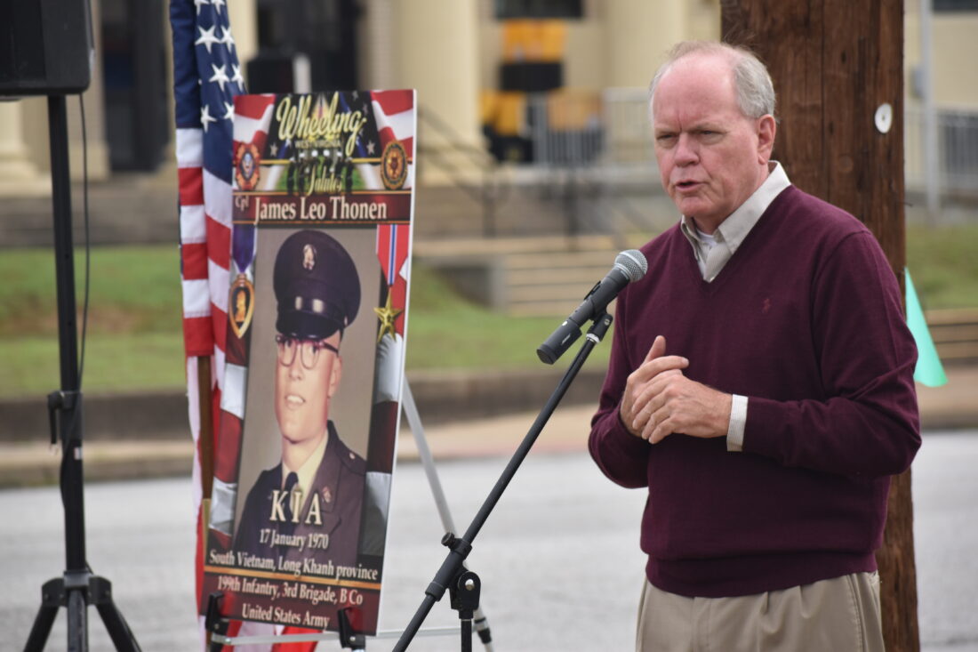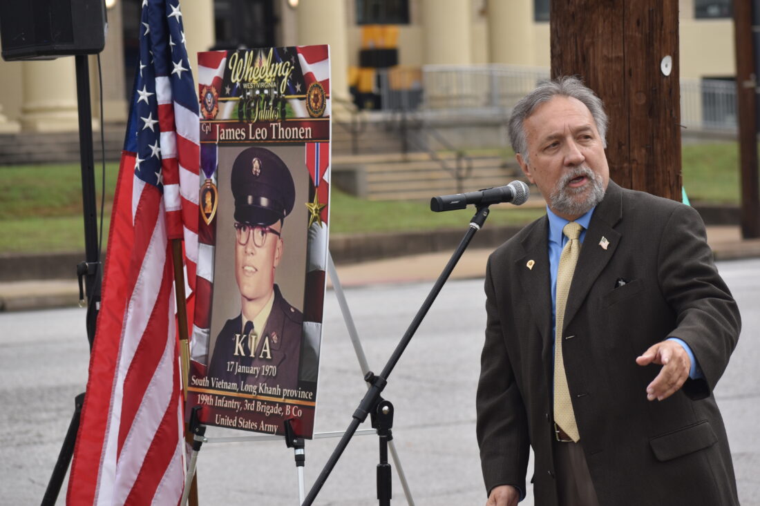 Wheeling Mayor Denny Magruder introduces speakers on hand Friday during a dedication of a military banner on Wheeling Island in honor of U.S. Army Cpl. James Thonen, who was killed in action in 1970 while serving in Vietnam. (Photo by Eric Ayres)