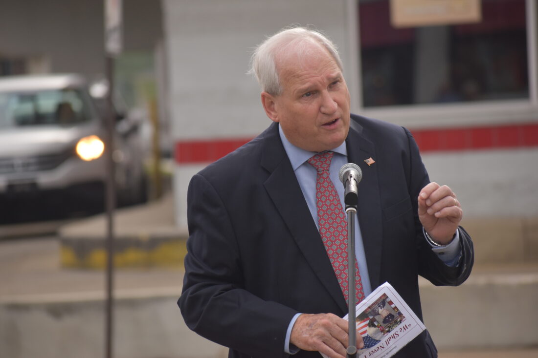 John Larch, volunteer coordinator of Wheeling’s Military Banner Program, speaks Friday during a dedication of the banner in honor of U.S. Army Cpl. James Thonen, a native of Wheeling Island who was killed in action in 1970 while serving in Vietnam. (Photo by Eric Ayres)