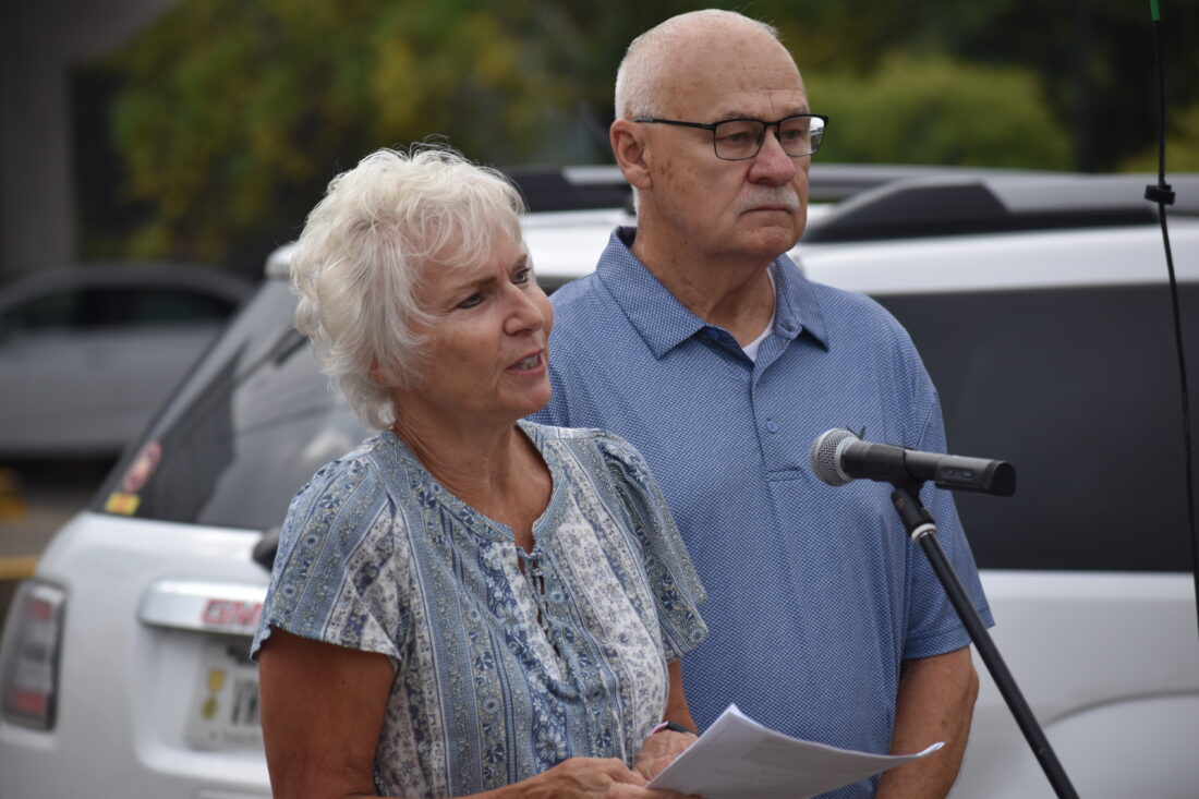 Sue Forrester, sister of U.S. Army Cpl. James Thonen, appears with her husband, Joe Forrester, during Friday’s military banner dedication on Wheeling Island. (Photo by Eric Ayres)