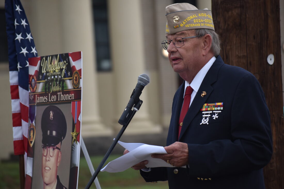 Chuck Ryan, vice commander of Wheeling VFW 4442, speaks about U.S. Army Cpl. James Thonen’s service in Vietnam during Friday’s military banner dedication in honor of Thonen, who was killed in action in 1970. (Photo by Eric Ayres)