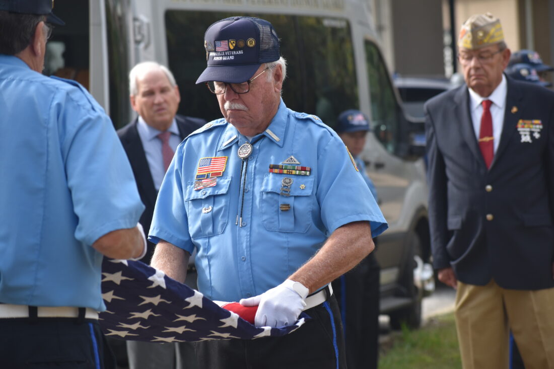 Paul Amrhein and fellow members of the Moundsville Veterans Honor Guard fold an American flag during Friday’s military banner dedication ceremony on Wheeling Island. (Photo by Eric Ayres)