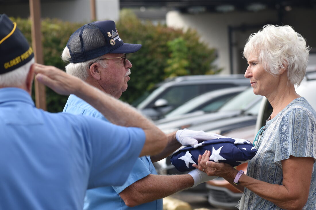 Paul Amrhein of the Moundsville Veterans Honor Guard presents an American flag to Sue Forrester, sister of the late U.S. Army Cpl. James Thonen. A native of Wheeling Island, Thonen was killed in action in 1970 while serving in Vietnam. (Photo by Eric Ayres)