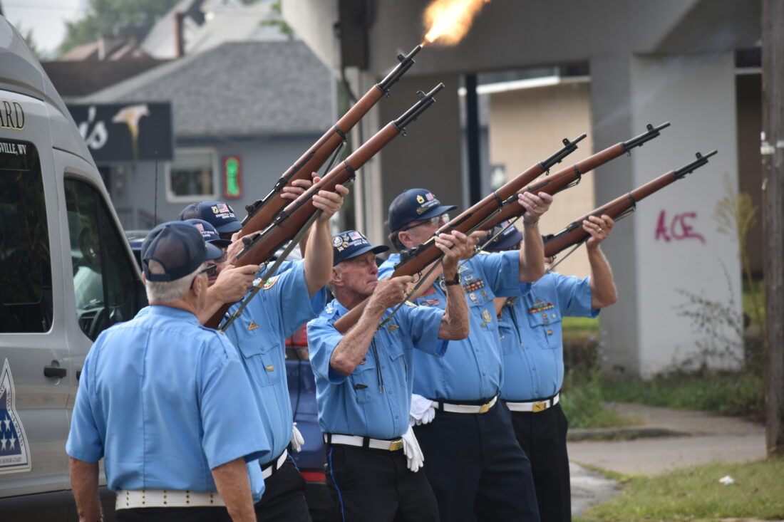 Members of the Moundsville Veterans Honor Guard perform a three-volley salute Friday on Wheeling Island in honor of U.S. Army Cpl. James Thonen, who was killed in action in 1970 while serving in Vietnam. (Photo by Eric Ayres)