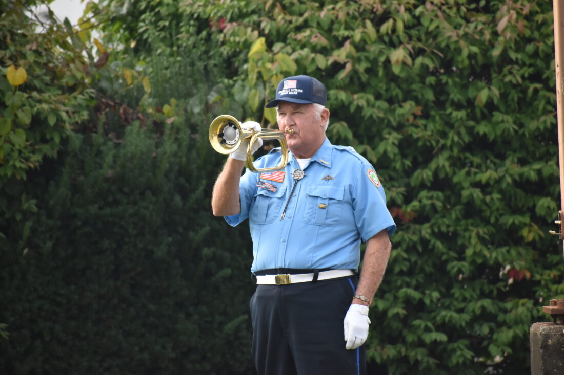 Gary Jenkins of the Moundsville Veterans Honor Guard performs taps on the bugle during Friday’s ceremony. (Photo by Eric Ayres)