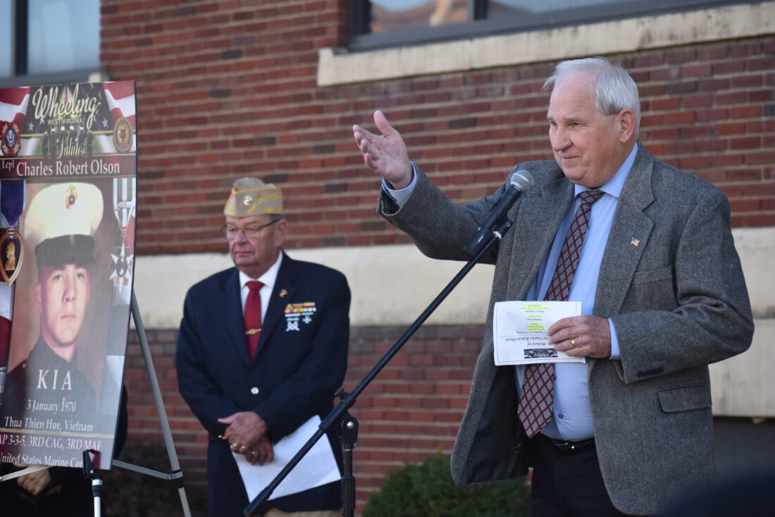 - Wheeling VFW Vice Commander Chuck Ryan addresses the crowd during a military banner dedication on Friday outside of Ritchie Elementary School in South Wheeling in honor of Lance Cpl. Charles Robert “Robbie” Olson, who was killed in action in Vietnam in 1970. (Photo by Eric Ayres)