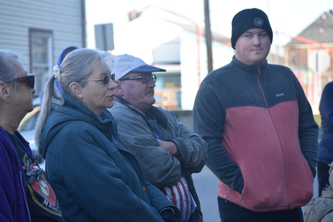 Wheeling Mayor Denny Magruder, right, welcomes guests to the military banner dedication Friday in South Wheeling in honor of Lance Cpl. Charles Robert “Robbie” Olson, who was killed in action in Vietnam in 1970. (Photo by Eric Ayres)
