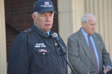 Dave Schoenian, president of the Moundsville Honor Guard, addresses the crowd gathered outside of Ritchie Elementary School on Friday during a military banner dedication in honor of Lance Cpl. Charles Robert “Robbie” Olson, who was killed in action in Vietnam in 1970. (Photo by Eric Ayres)