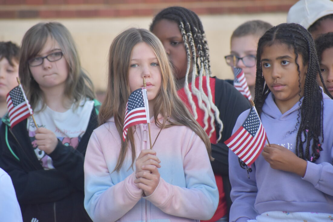 Fifth grade students from Ritchie Elementary School in South Wheeling wave American flags during Friday's military banner dedication ceremony outside of the school building. The students led participants in the pledge of allegiance. (Photo by Eric Ayres)