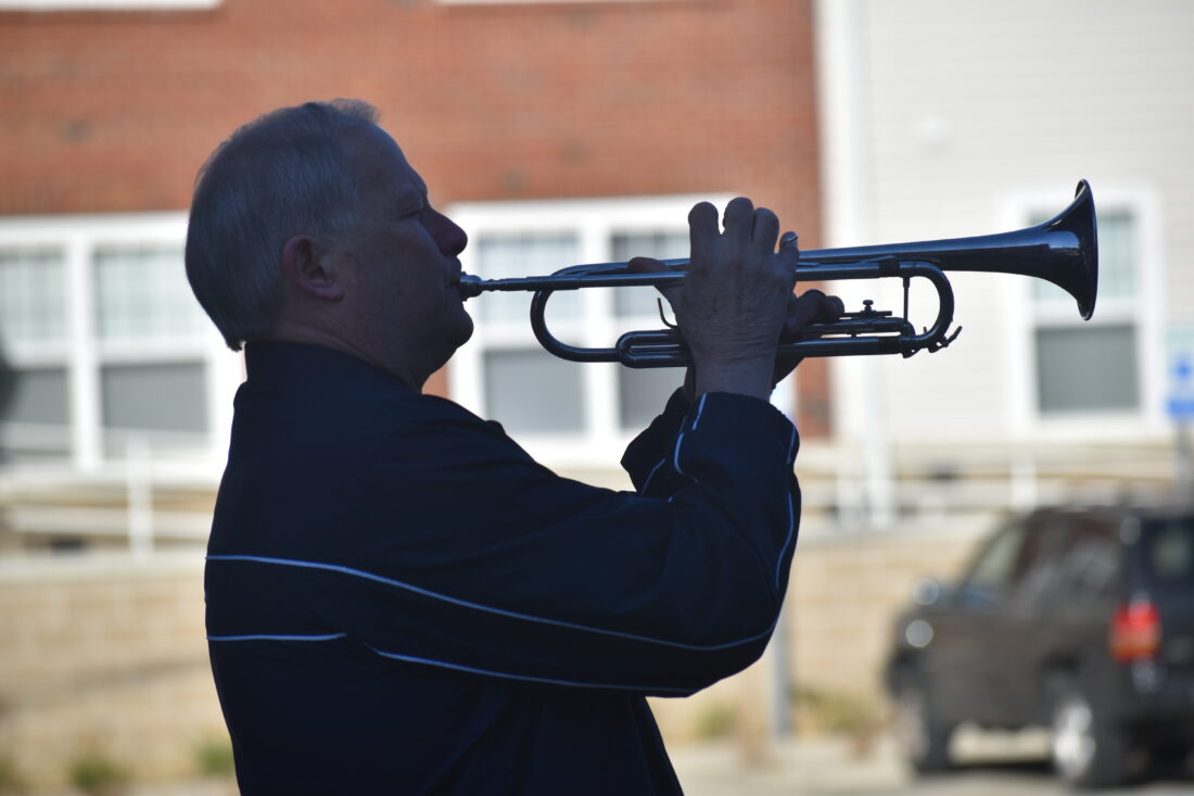 Dale Olson, decorated U.S. Air Force veteran and cousin of Lance Cpl. Robbie Olson, performs taps on the bugle during a military banner dedication Friday in South Wheeling. Dale Olson was 11 years old when his cousin, Robbie, 19, was killed in action in Vietnam in January 1970. (Photo by Eric Ayres)