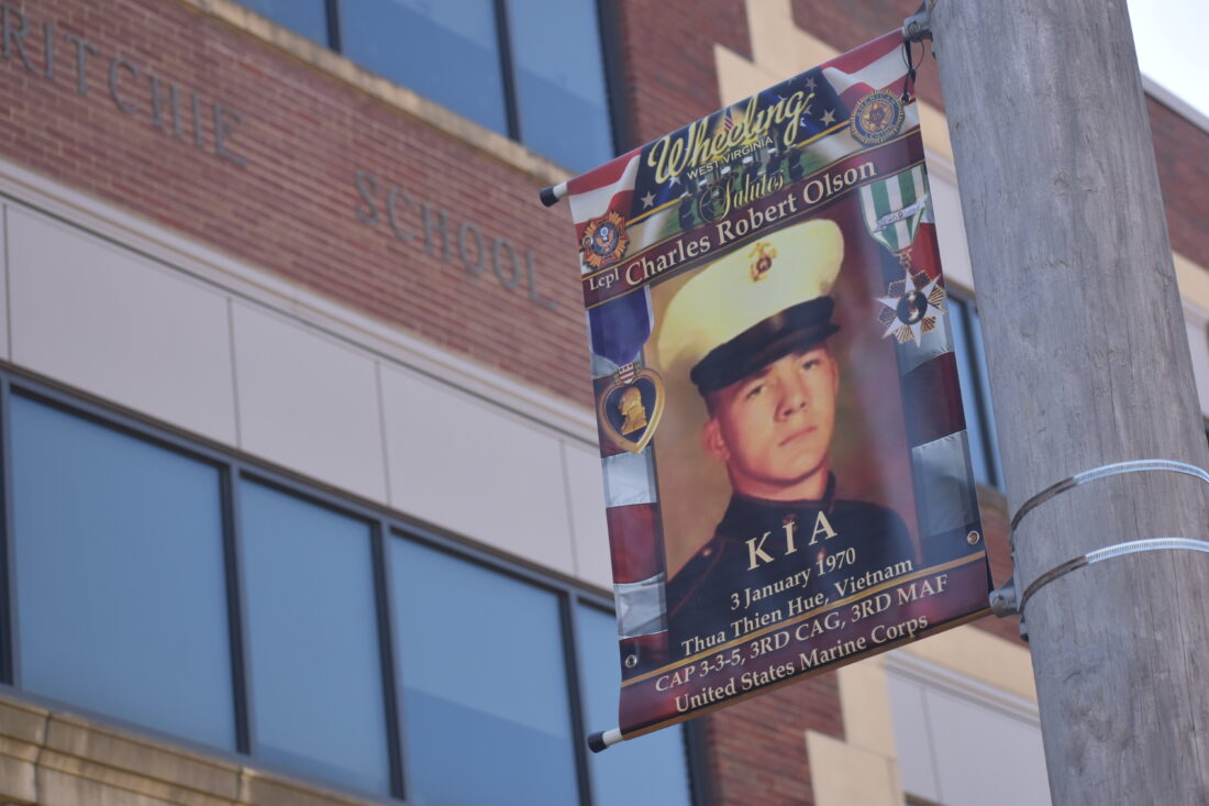 - A military banner is displayed on Wood Street in South Wheeling near Ritchie Elementary School in honor of Lance Cpl. Charles Robert “Robbie” Olson, who was killed in action at the age of 19 while serving his country in Vietnam in 1970. Olson’s family home in his youth once stood across the street where the 36th Street Pool is located today. (Photo by Eric Ayres)