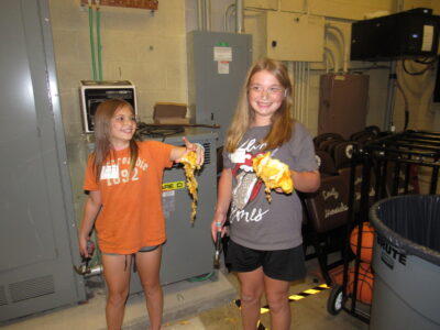 Central Elementary School students Harper Behrens and Cassidy Conroy were among 140 girls who attended the event. They learned that trying to break open a warty-looking gourd with a hammer is not as easy as it looks.