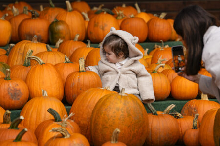 Little Ella is photographed by her mother, surrounded by pumpkins at the Sanders Farm in Castrop-Rauxel, Germany, Thursday, Oct. 17, 2024. (AP Photo/Martin Meissner)
