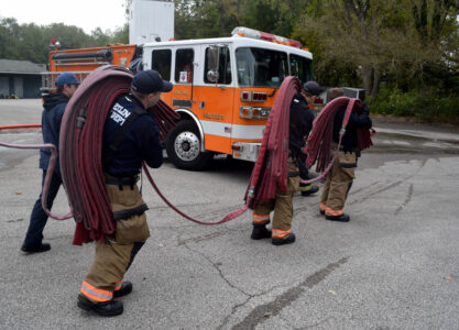 Wheeling firefighters carry a 400-foot hose in a class taught through GRIT Fire Training on how to transport hoses longer distances between fire and water source.