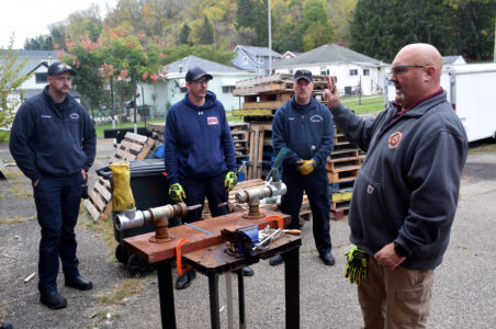 Toronto, Ohio, firefighter Lance Winstel, in the gray sweatshirt, leads firefighters from various cities through a class on rescuing a victim whose arm has been impaled on rebar.