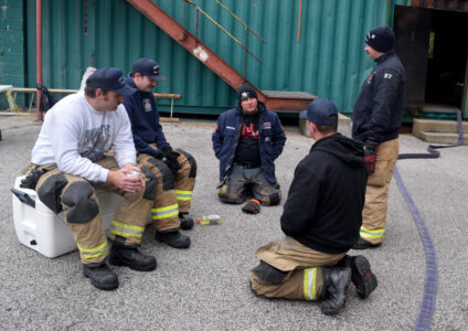 GRIT Fire Training instructor Sean Sokolowski talks to firefighters from around West Virginia during training on Wheeling Island.