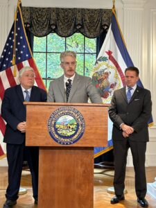 Incoming Washington Center Director Patrick Lee Miller, flanked by Gov. Patrick Morrisey, left, and WVU President Michael Benson, right, speaks at an Oct. 29 press conference welcoming him as the new center’s founding director.
