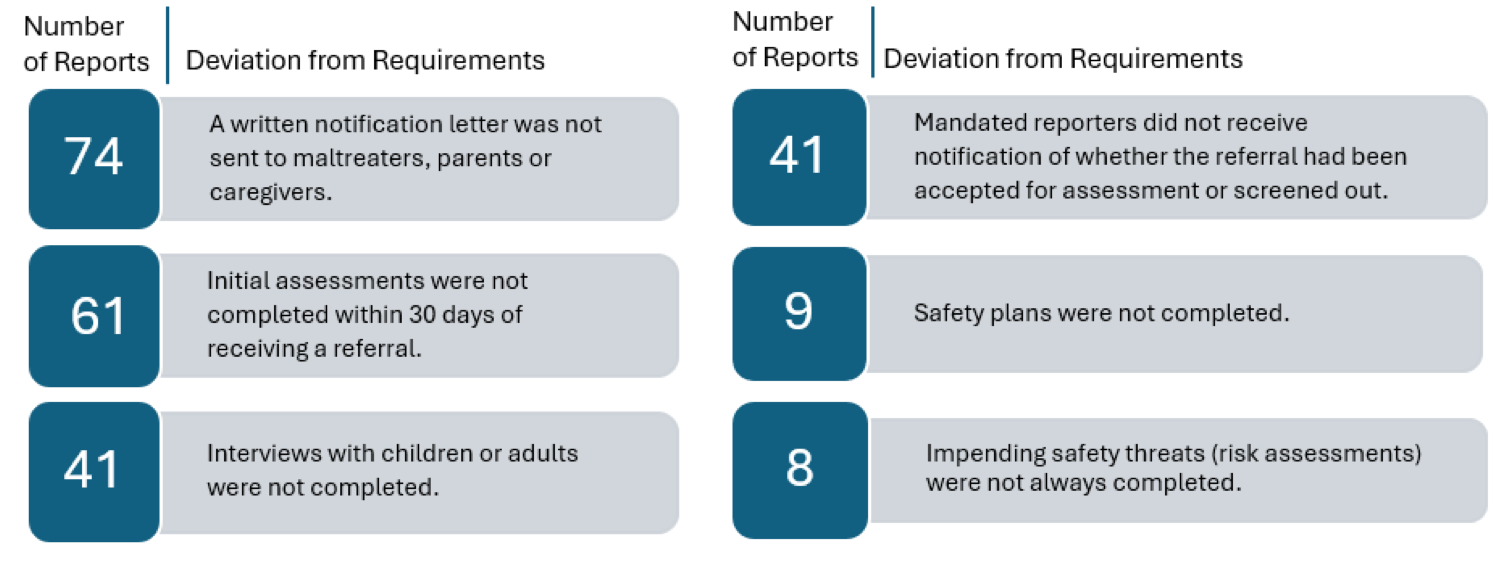 Of the 100 audited cases: 74 reports did not include a required written notification letter; initial assessments were not completed within 30 days of receiving a referral in 61 reports; 41 reports included no required interviews with children or adults during the initial assessment; mandated reporters did not receive notification of whether a child abuse and neglect referral had been accepted for assessment or screened out in 41 reports; nine reports included no required safety plan; and eight reports did not include required impending safety threat risk assessments.