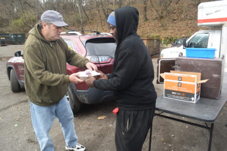 Ray Duane, left, helps hand out free meals Wednesday as Dean Barath and Ideal Provisions distributed meals at Wheeling’s homeless encampment.