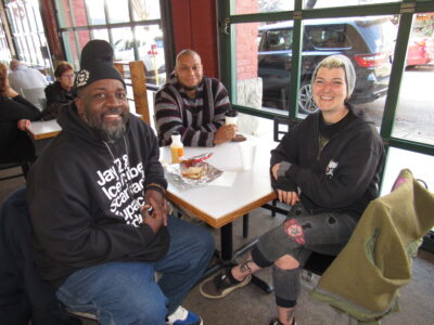 Many Ohio Valley residents are thankful for friends and family this Thanksgiving. Enjoying lunch together at Centre Market in Wheeling on Wednesday are Ron Scott of Wheeling, Jermaine Lucious of Wheeling and Moriah David of Martins Ferry.