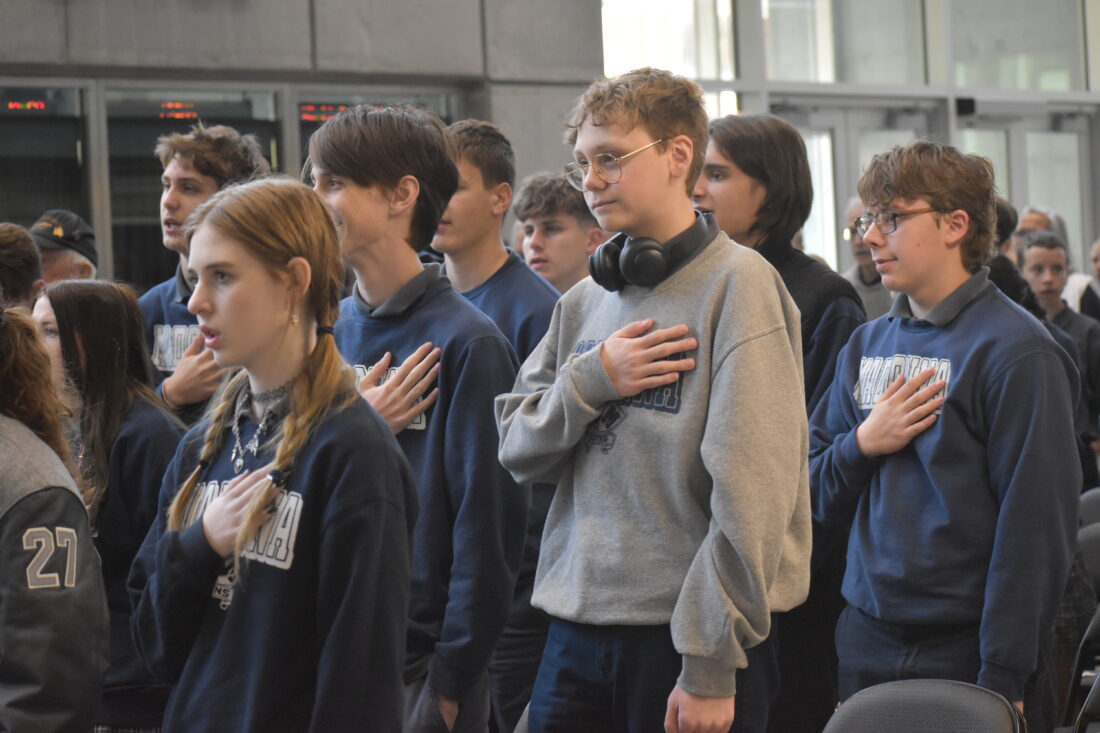 Students from Weirton Madonna High School attend a Veterans Day service presented by American Legion Post 1 in Wheeling Tuesday at WesBanco Arena.