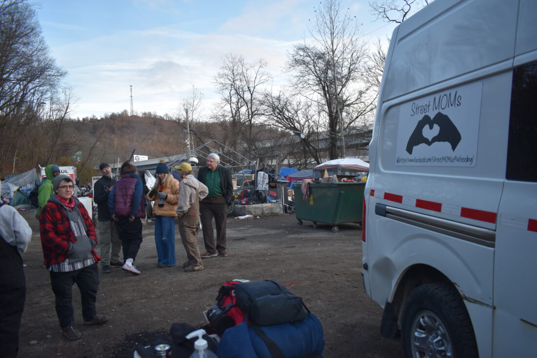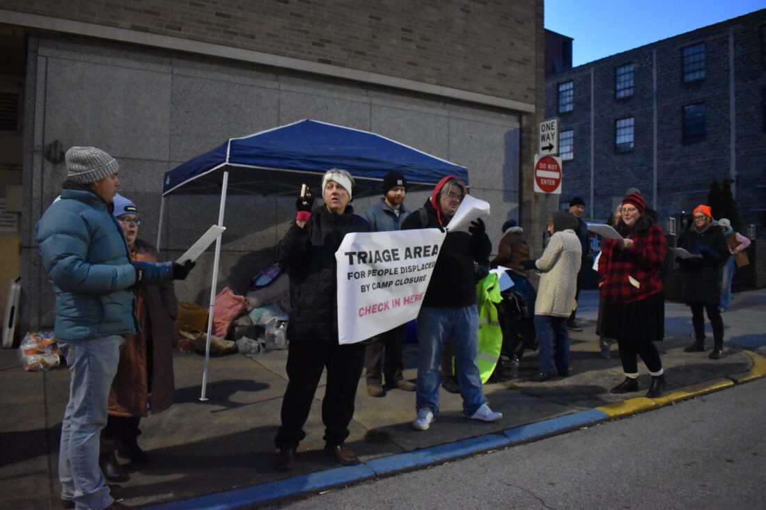 Representatives of Ohio Valley Mutual Aid, House of Hagar and Ohio Valley Cares staged a “tent triage” outside the City-County Building on Chapline Street downtown Monday night at the same time the camp closure was scheduled. The group collected blankets and supplies, sang Christmas carols and helped direct displaced people from the camp to emergency resources. They also provided a voice for their homeless neighbors, they noted.