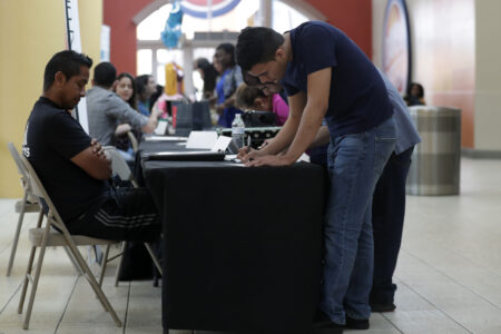 Billy Ramos, right, fills out a job application with Adidas during a job fair at Dolphin Mall, Tuesday, Oct. 1, 2019, in Miami. (AP Photo/Lynne Sladky)