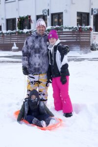 - Cody Zuke retires from sledding at Wheeling Park with his children Julia Zuke, right, and Jett Zuke, on sled.