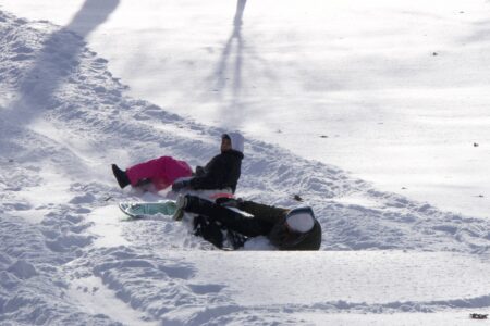 - Mother Nicole Galberth, left, and daughter Teanna Galberth spend their day Sunday sledding down the hill at Wheeling Park.