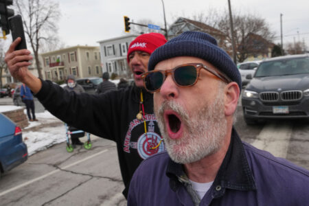 People shout toward Border Patrol agents making an arrest, Sunday, Jan. 11, 2026, in Minneapolis. (AP Photo/Adam Gray)