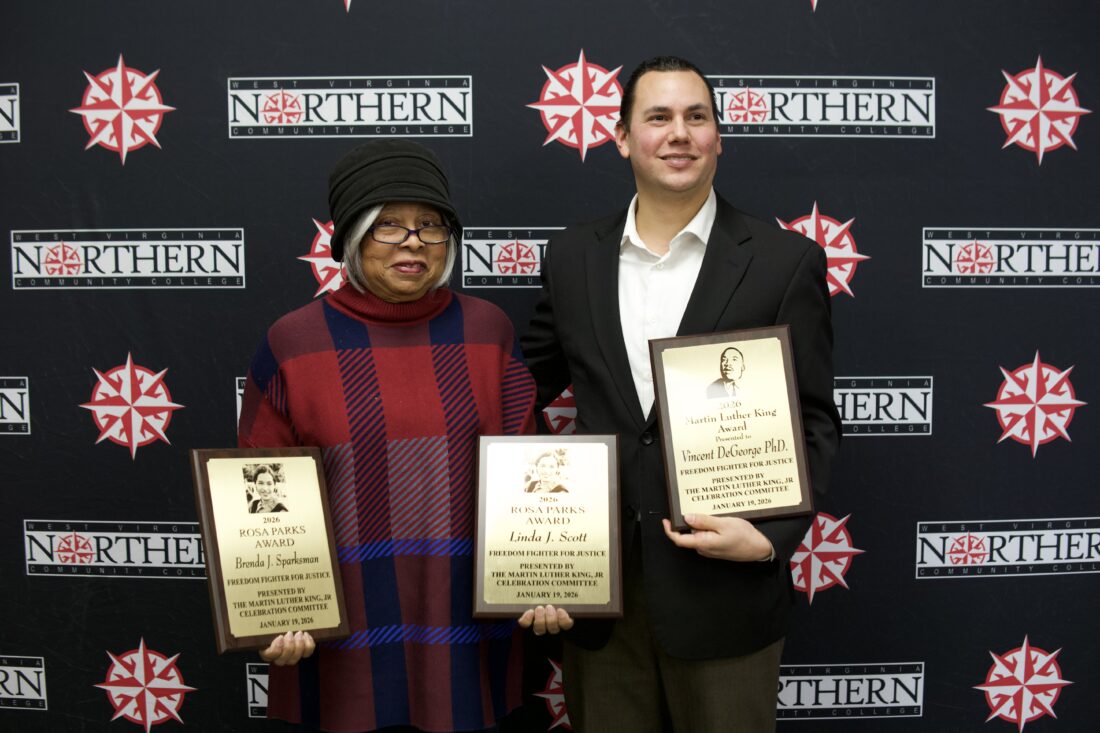 Wheeling resident Brenda J. Sparksman, left, holds her and her sister Linda Joyce Scott’s Rosa Parks Award as Wheeling resident Vincent DeGeorge holds his Dr. Martin Luther King award during a ceremony sunday at West Virginia Northern Community College’s downtown Wheeling campus.